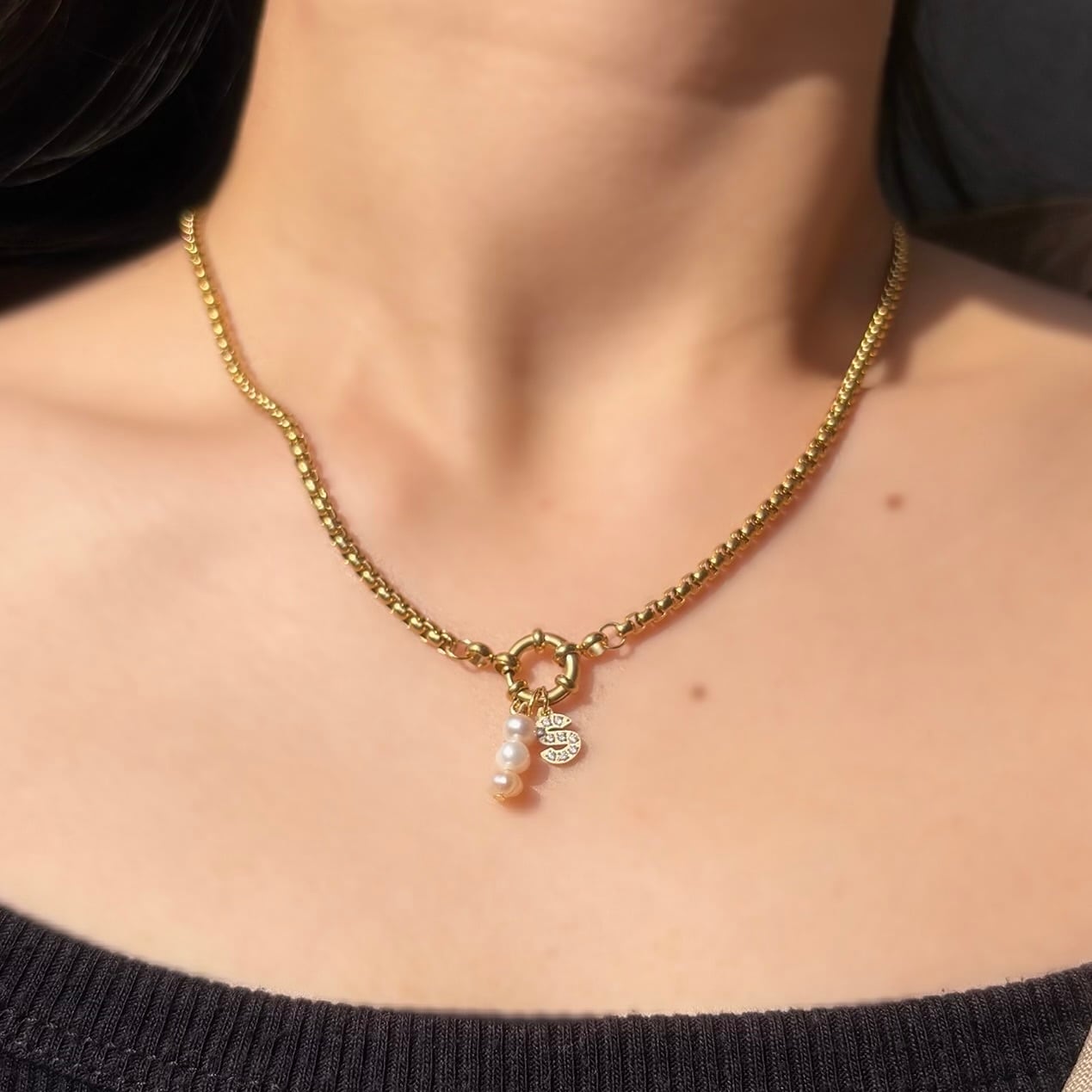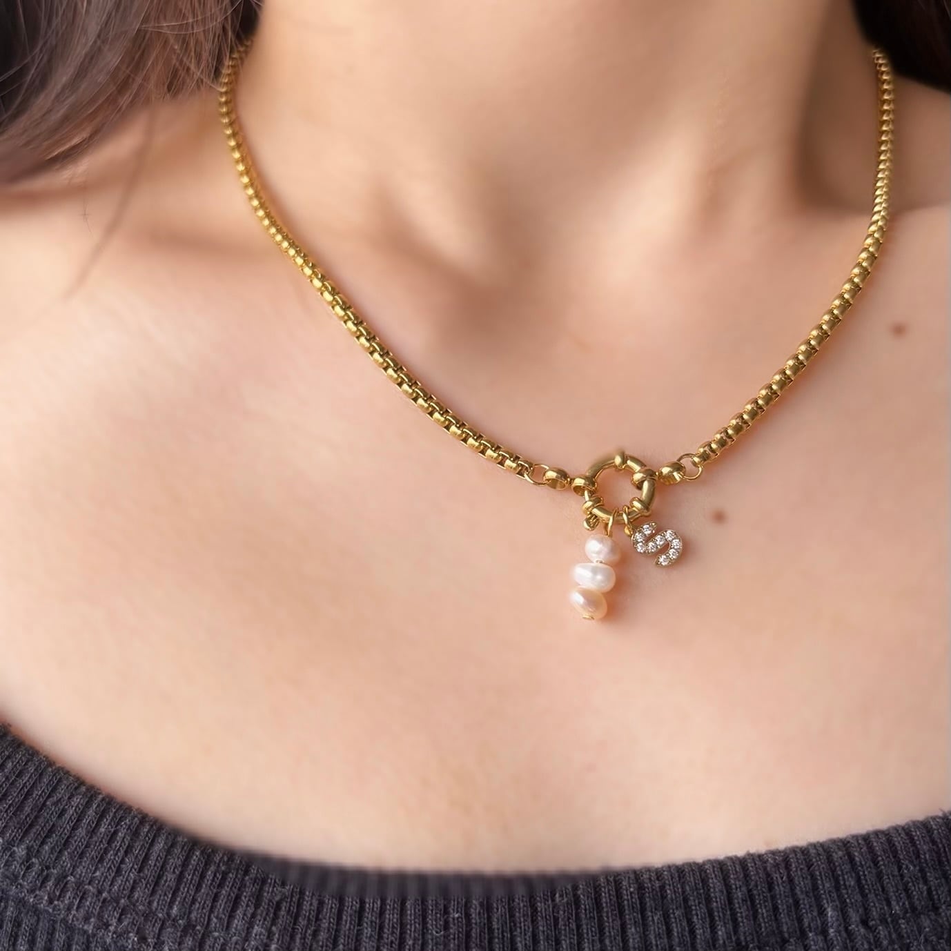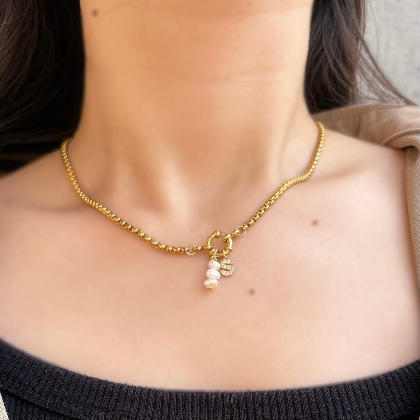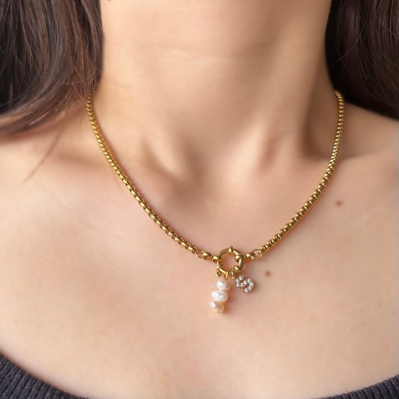 大人気のジルコニアイニシャルと淡水パールを組み合わせたネックレス。