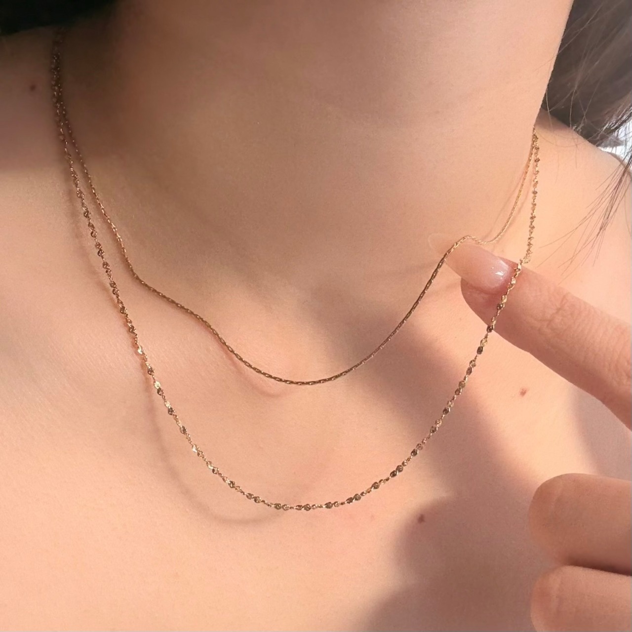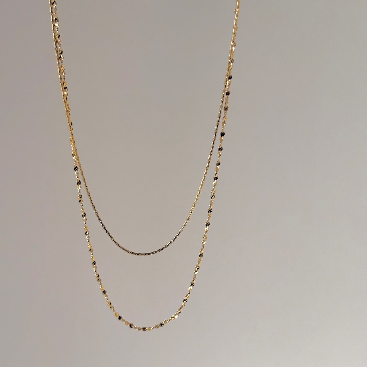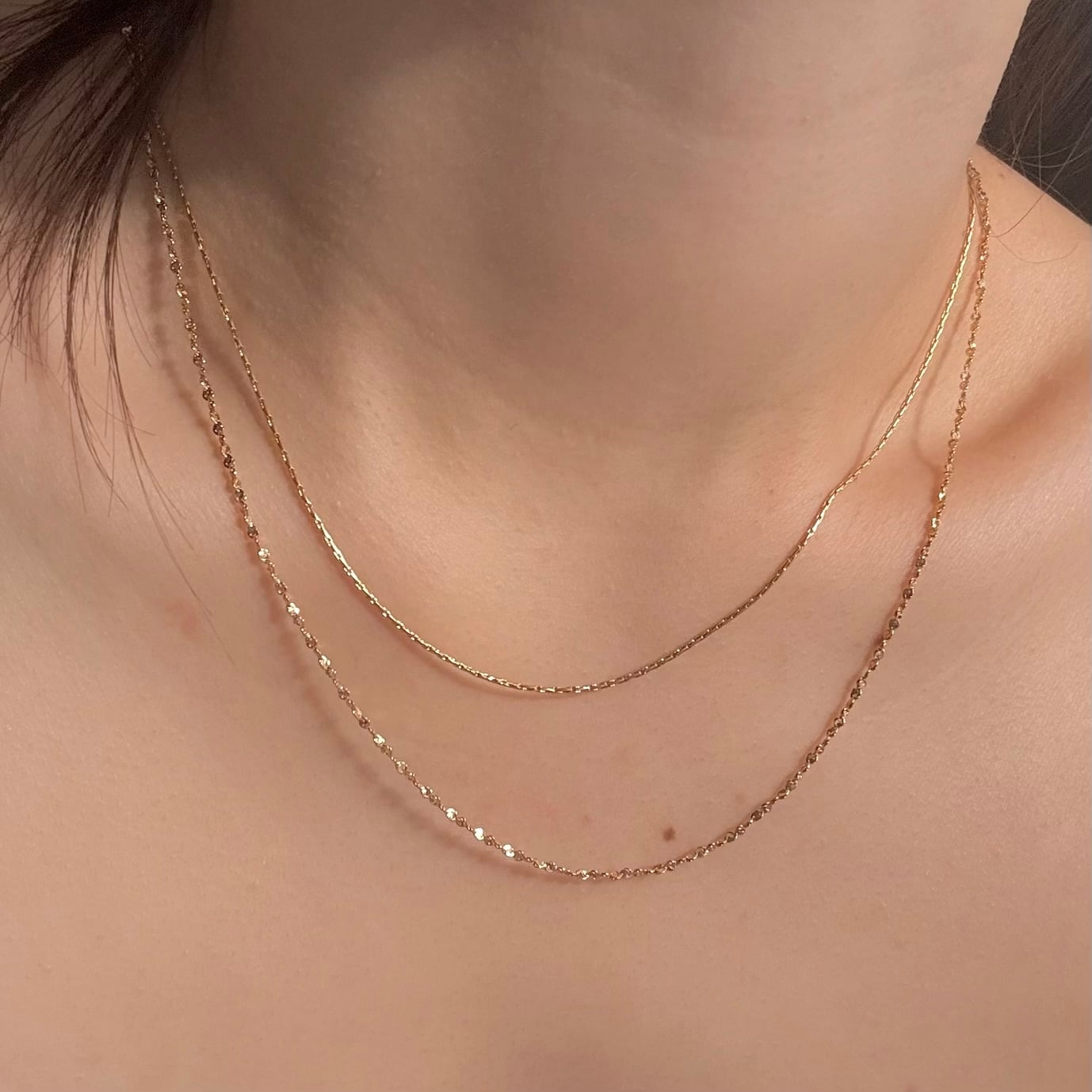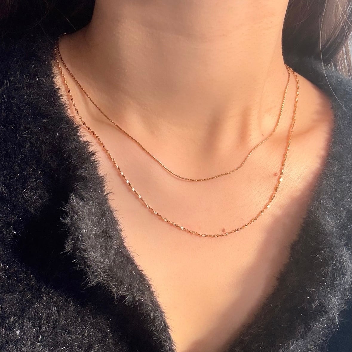 大人気定番の1mmの極細チェーンと0.8mm極細チェーンが1つになったレイヤードネックレス。