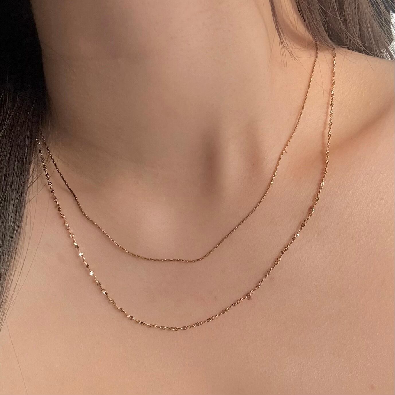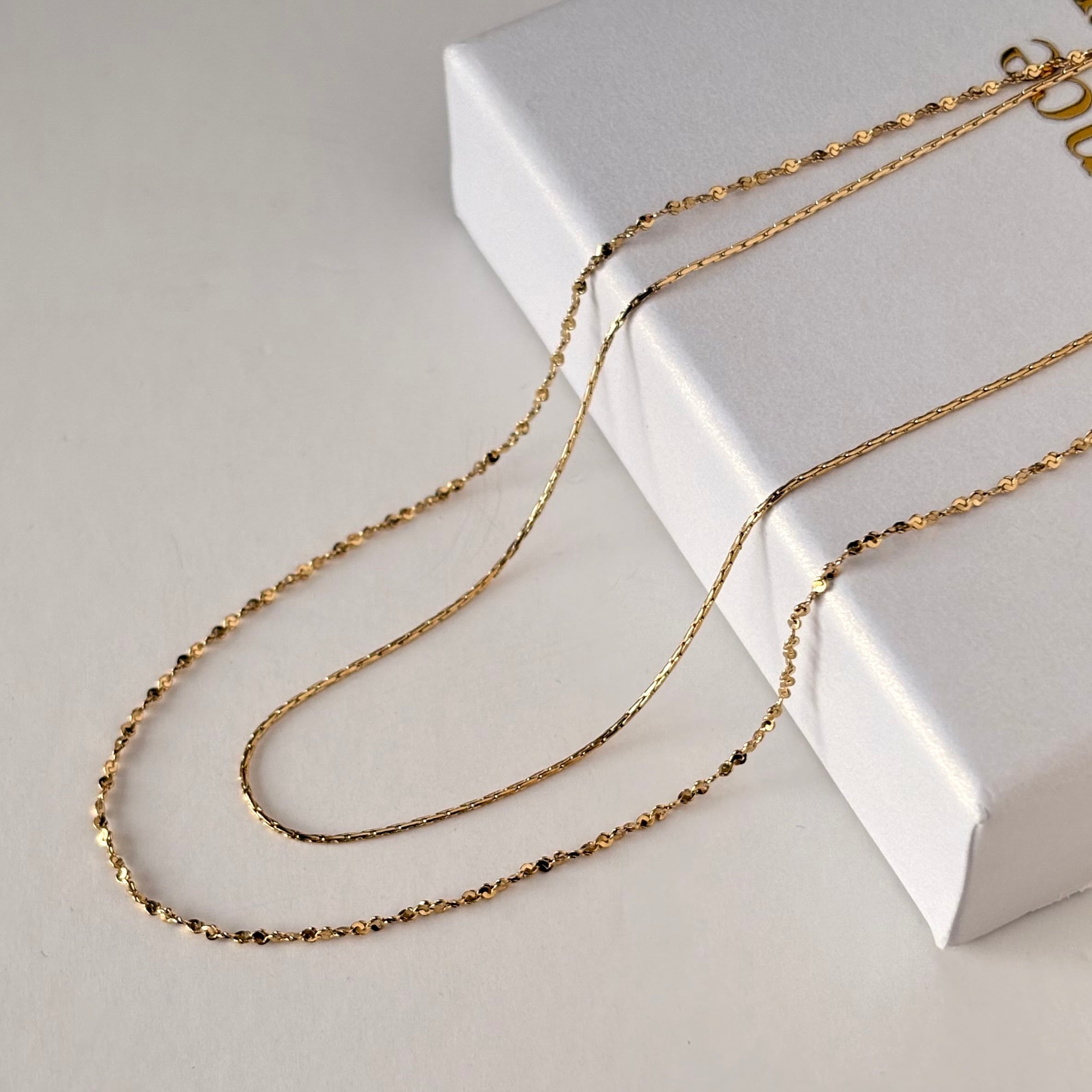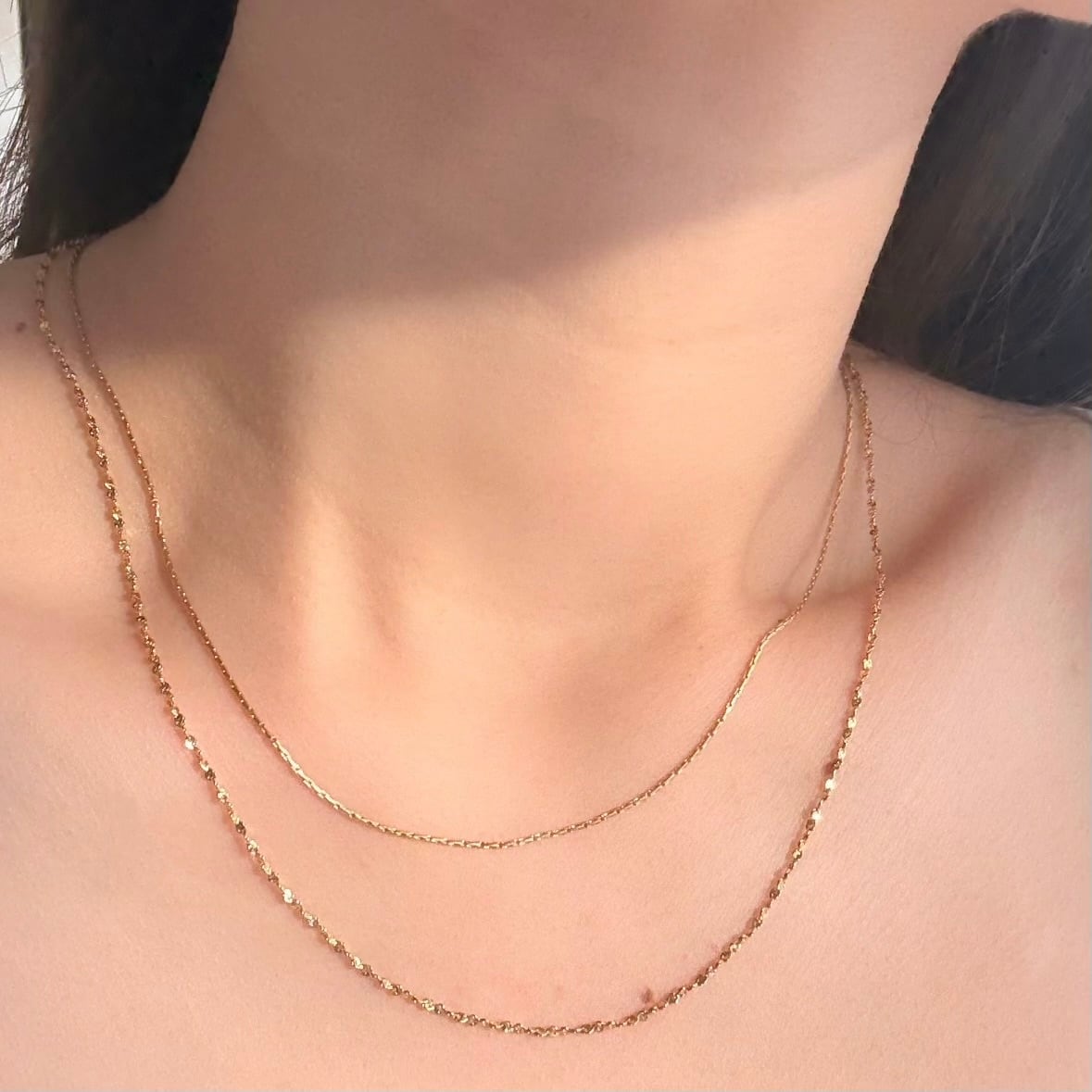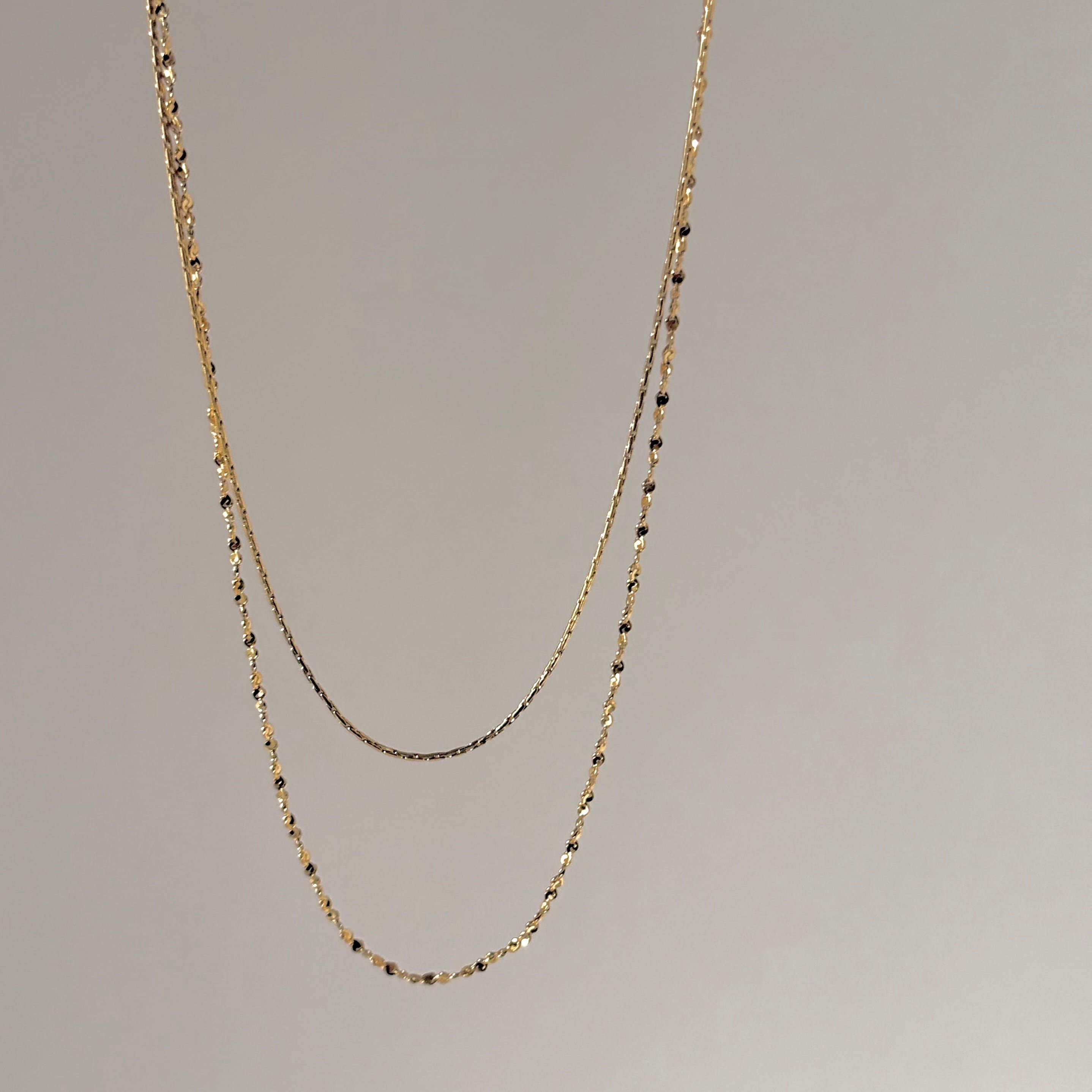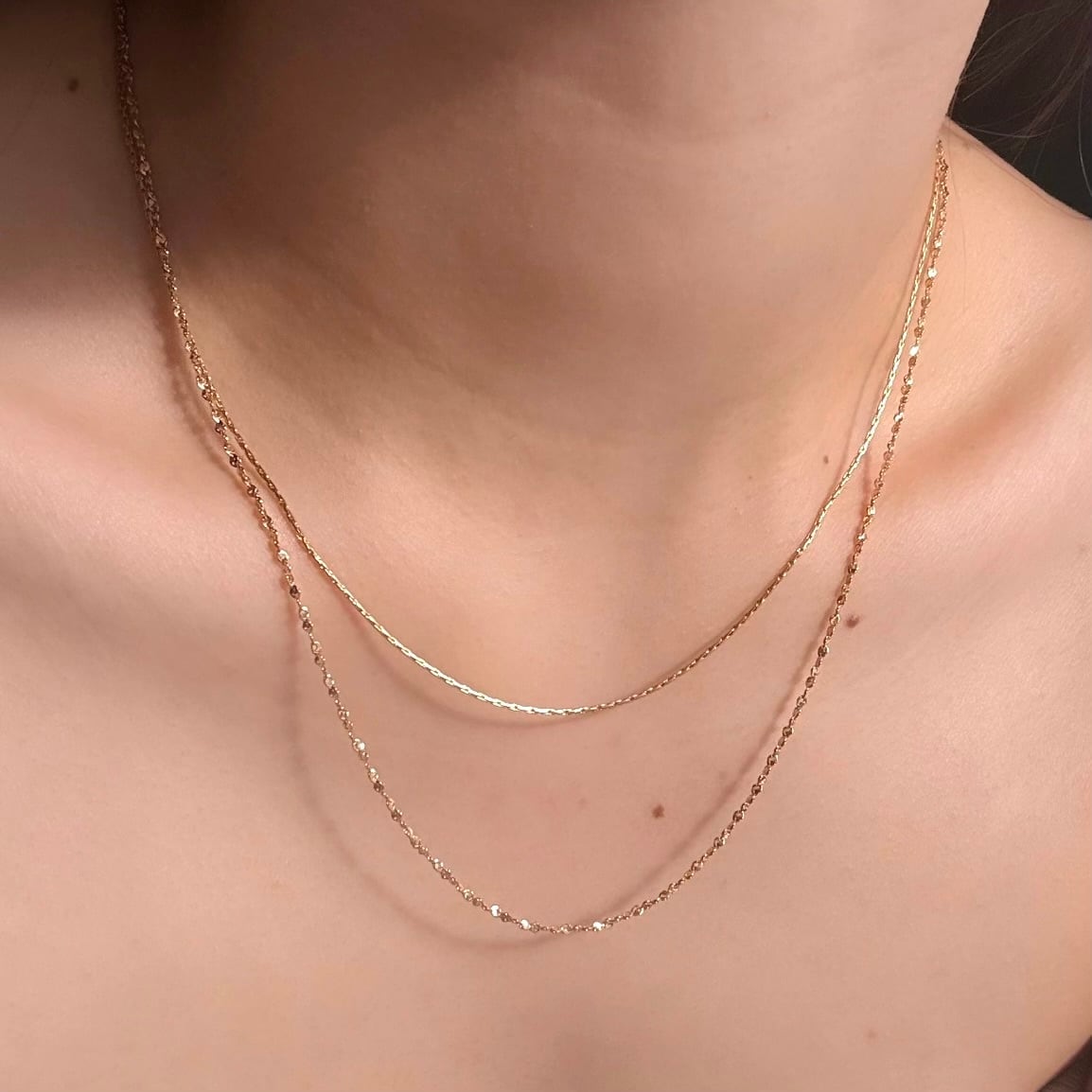 大人気定番の1mmの極細チェーンと0.8mm極細チェーンが1つになったレイヤードネックレス。