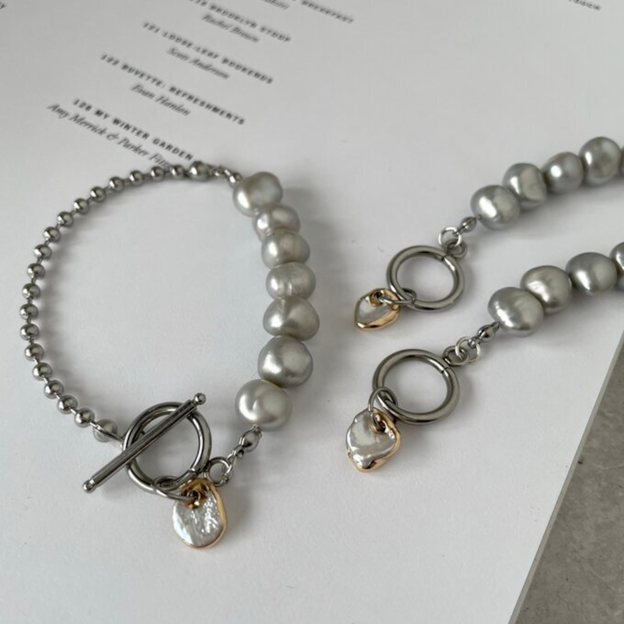 ステンレスボールチェーンと淡水パールのマンテルブレスレット