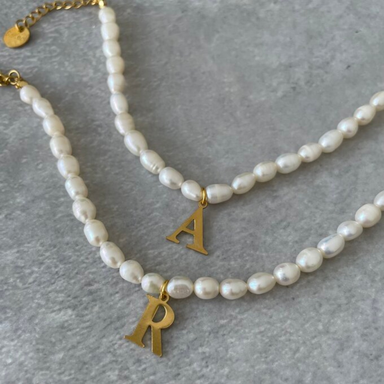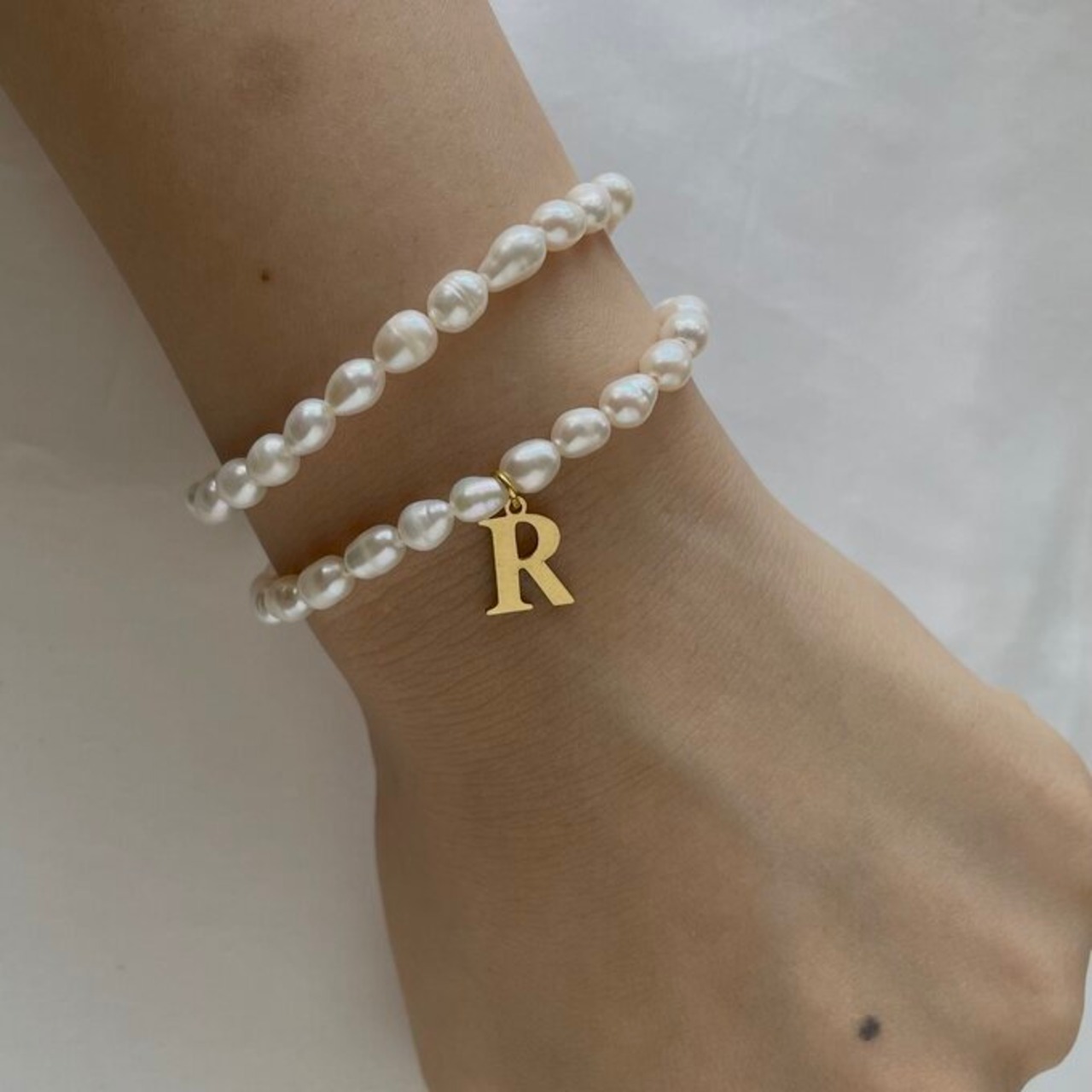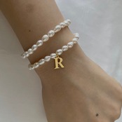 選べるイニシャルチャーム 淡水ライスパール ステンレス 18k ブレスレット