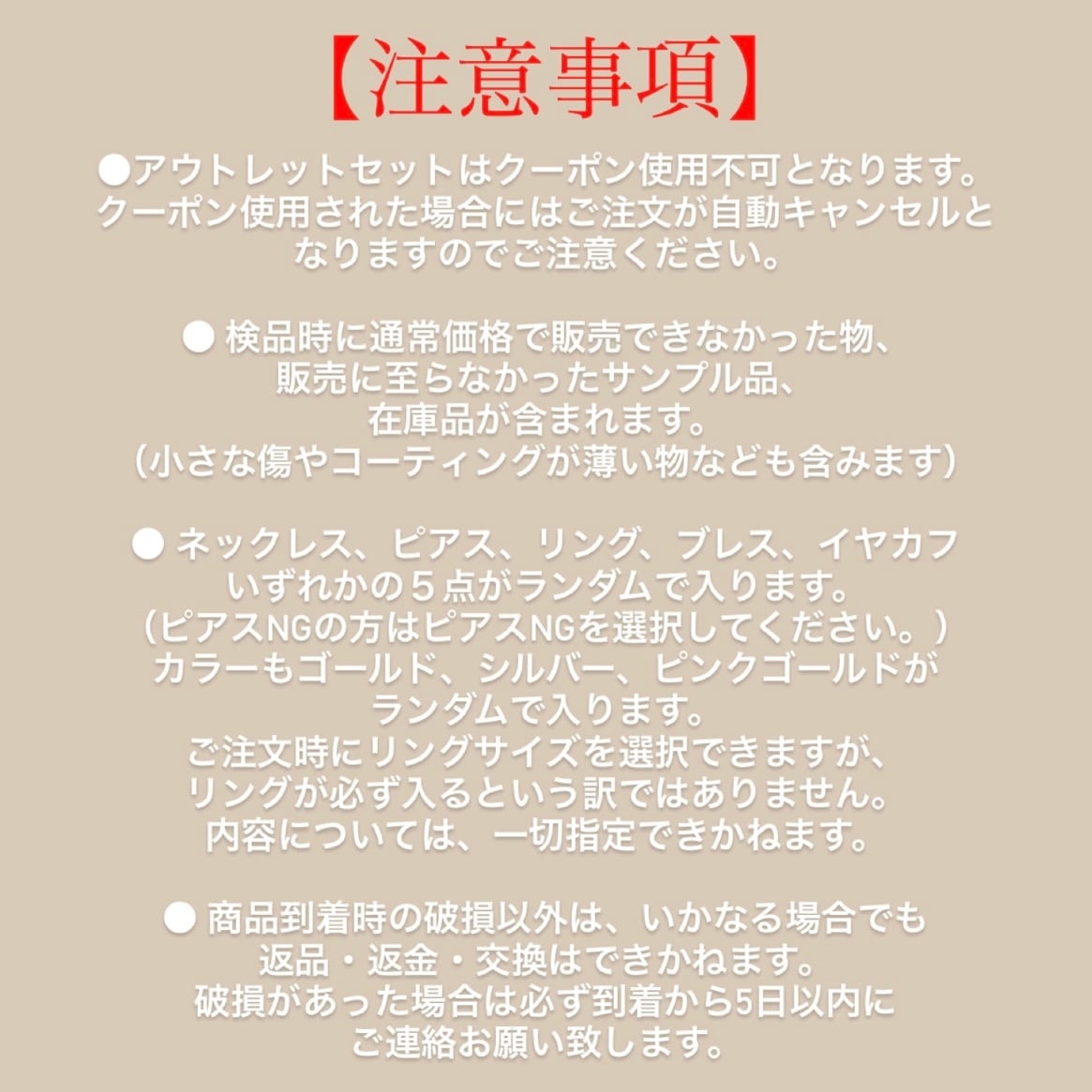 ⚫︎ネックレス、ピアス、リング、ブレス、イヤカフいずれかの5点がランダムで入ります。