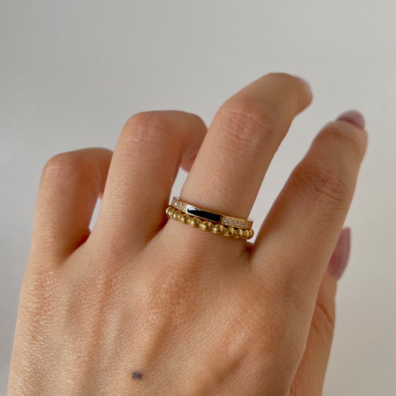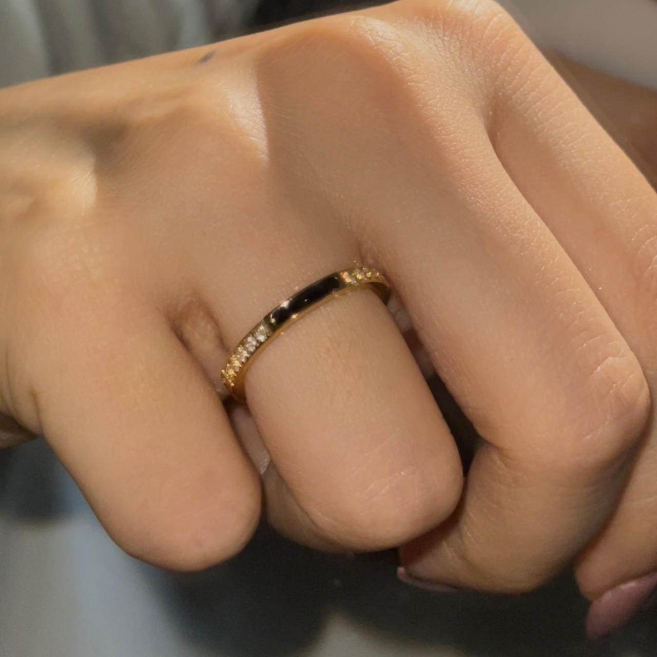 キラキラと輝くジルコニアとブラックカラーがワンポイントの細身リングです。